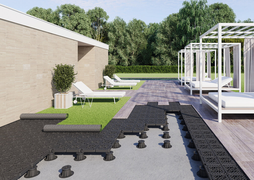 Ďalej umožňuje väčšie designové uloženie dlažby na vašej terase. (kombinácia rôznych tvarov dlažby a ďalších terasových materiálov ako je umelý trávnik, živý trávnik, kačírok, keramzit, štrk atď.)